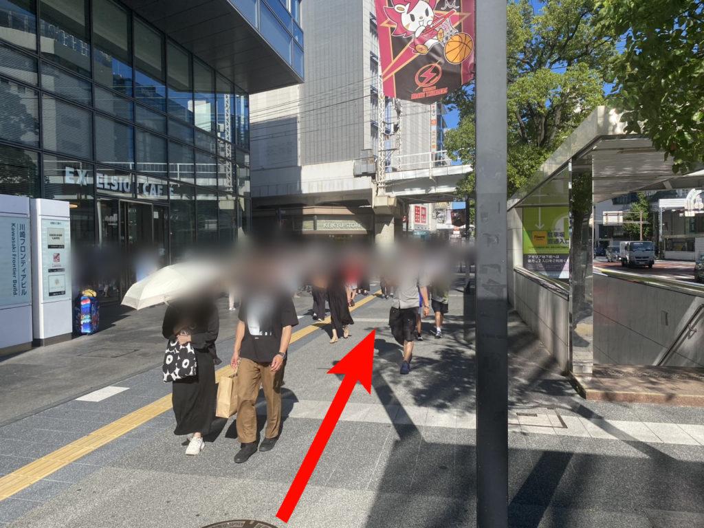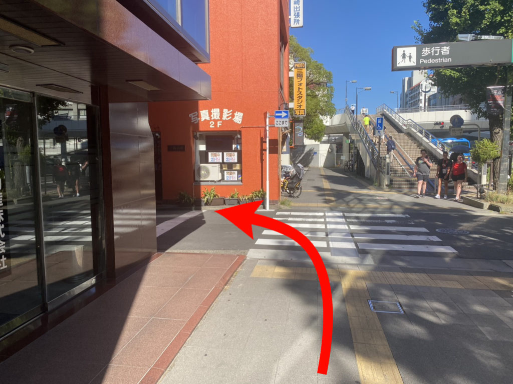 正面に見えてくる地下への階段は降りず、左の横断歩道を渡ります。
